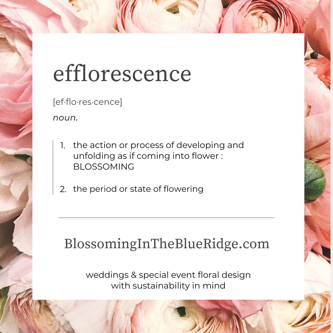 The word "efflorescence" (pronounced eff-lor-ess-ense) is the scientific term for the process of blossoming. The Merriam-Webster Dictionary defines efflorescence as "the action or process of developing and unfolding, as if coming into flower."